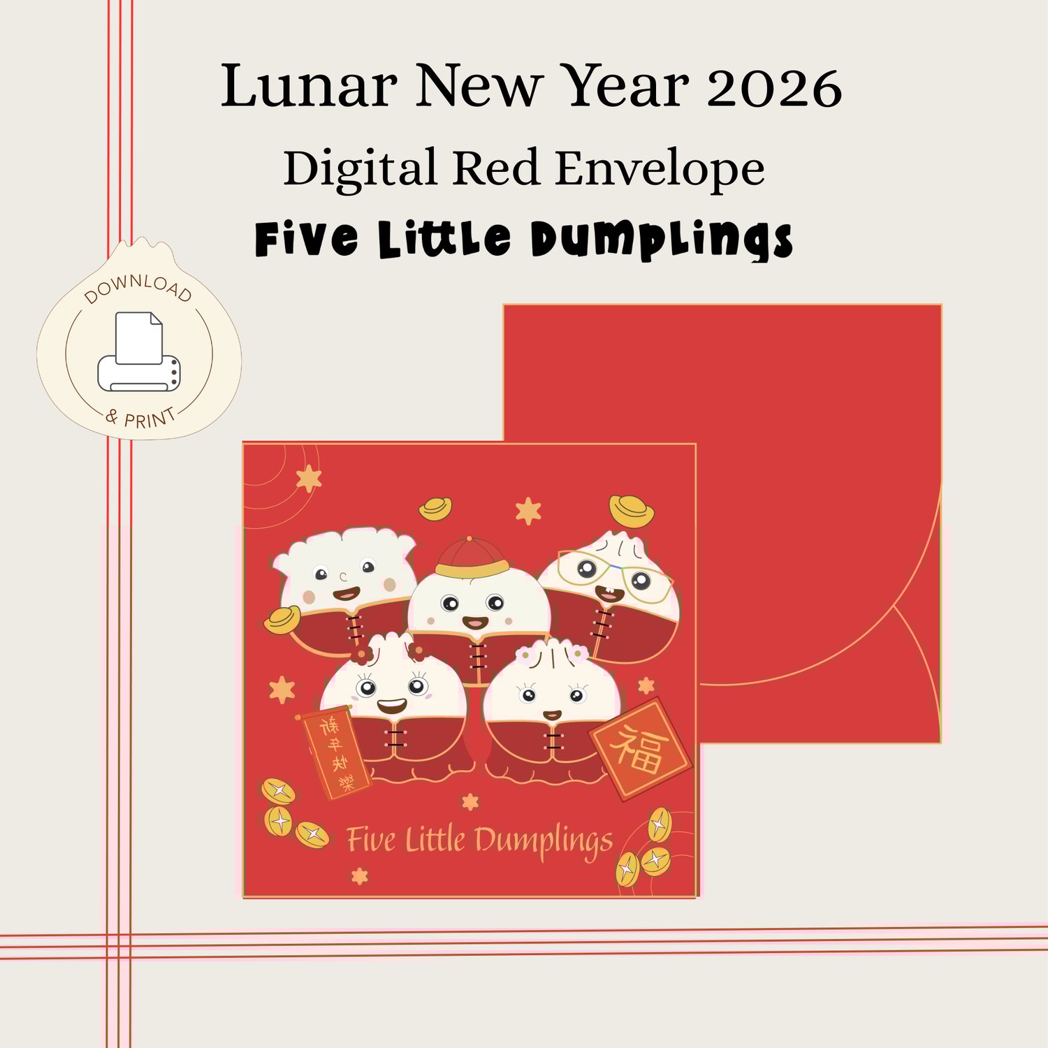 Celebrate the Lunar New Year 2026 with this charming "Five Little Dumplings" digital download. This printable template allows you to create your own custom red envelopes (hongbao) featuring adorable dumpling characters, perfect for sharing luck and prosperity with friends and family.