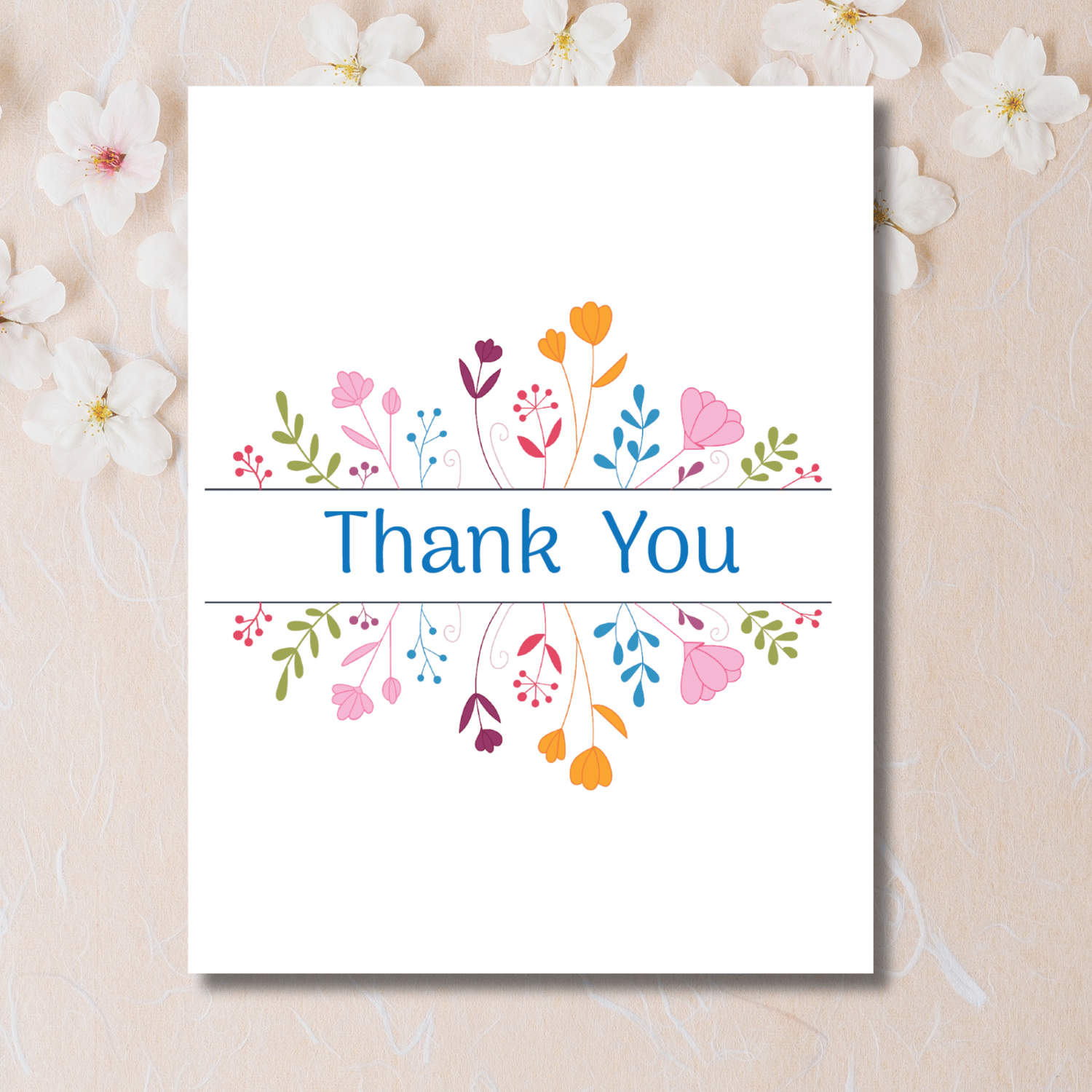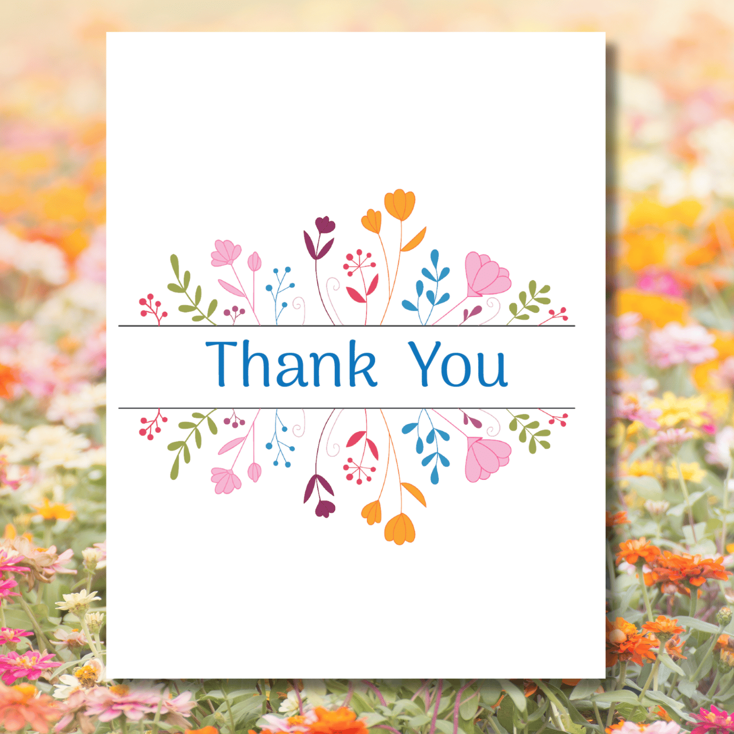 Express heartfelt gratitude with this charming handmade thank you card! Featuring a beautifully illustrated floral design in vibrant, cheerful colors, this card brings a fresh and uplifting touch to your message of appreciation. The elegant “Thank You” text is framed by delicate blooms and leafy accents, making it perfect for any occasion—from weddings and baby showers to everyday acts of kindness. Blank inside to leave space for your personalized message, this card is as thoughtful as it is beautiful.