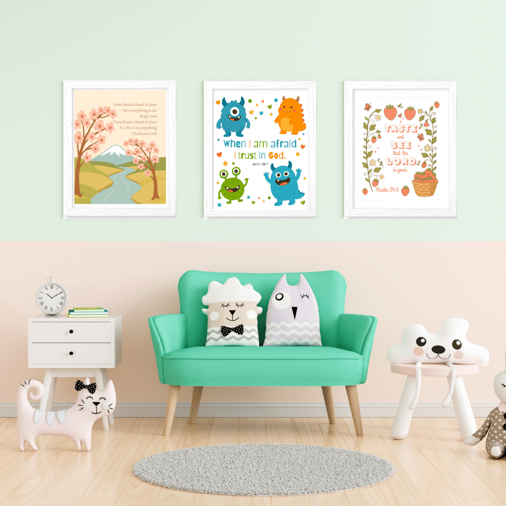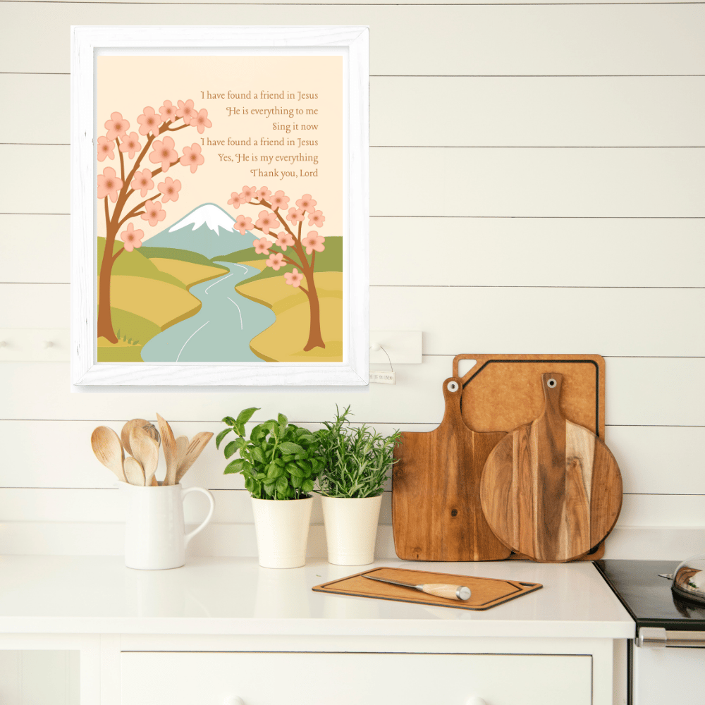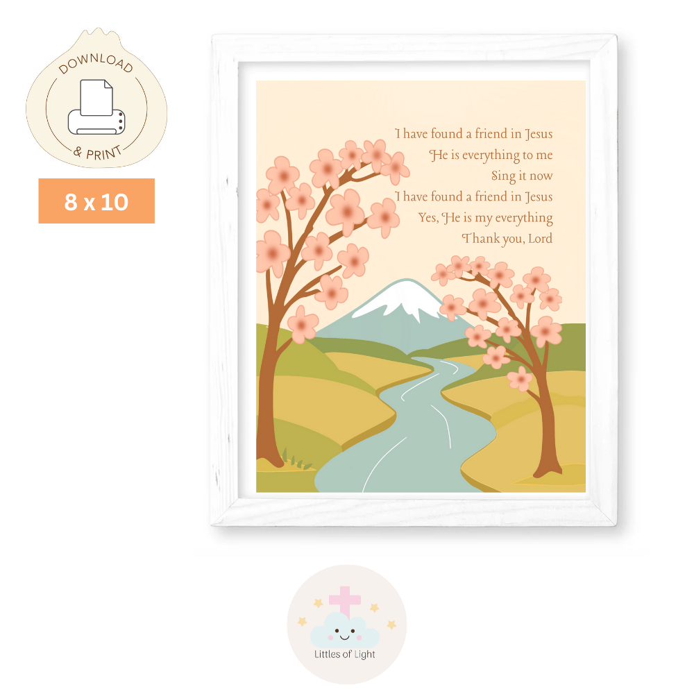 Bring joy and encouragement to your child's room with our "Friend in Jesus" 8x10 Wall Art. Featuring a sweet riverside scene with blooming cherry trees and a snowy mountain backdrop, this charming artwork shares a heartfelt message of friendship and faith. Designed in soft pastel colors, it's perfect for creating a peaceful and uplifting atmosphere in bedrooms, nurseries, or playrooms. Printed on high-quality cardstock, this beautiful piece reminds little hearts of the love and friendship found in Jesus. A meaningful gift for birthdays, baptisms, or everyday inspiration!